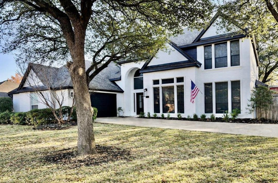 This striking Texas family home blends classic architecture with modern curb appeal, set on a spacious, tree-lined lot. The exterior features a tasteful contrast of white brick and dark siding, creating a timeless yet contemporary look. Mature trees frame the property beautifully, offering shade, privacy, and a welcoming sense of permanence. Large, well-positioned windows flood the interior with natural light, while the thoughtful layout suggests generous living spaces ideal for family life and entertaining. The home’s design balances character and function, with clean lines, a prominent chimney feature, and a roofline that adds depth and architectural interest.